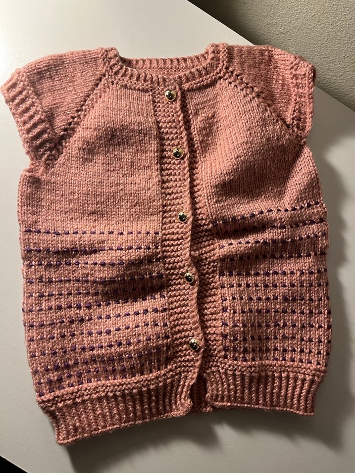 Yumuşak örgüden yapılmış, pastel pembe renkli, kolsuz ve ince desenli kız çocuk hırkası, normcore tarzda uyum sağlar.