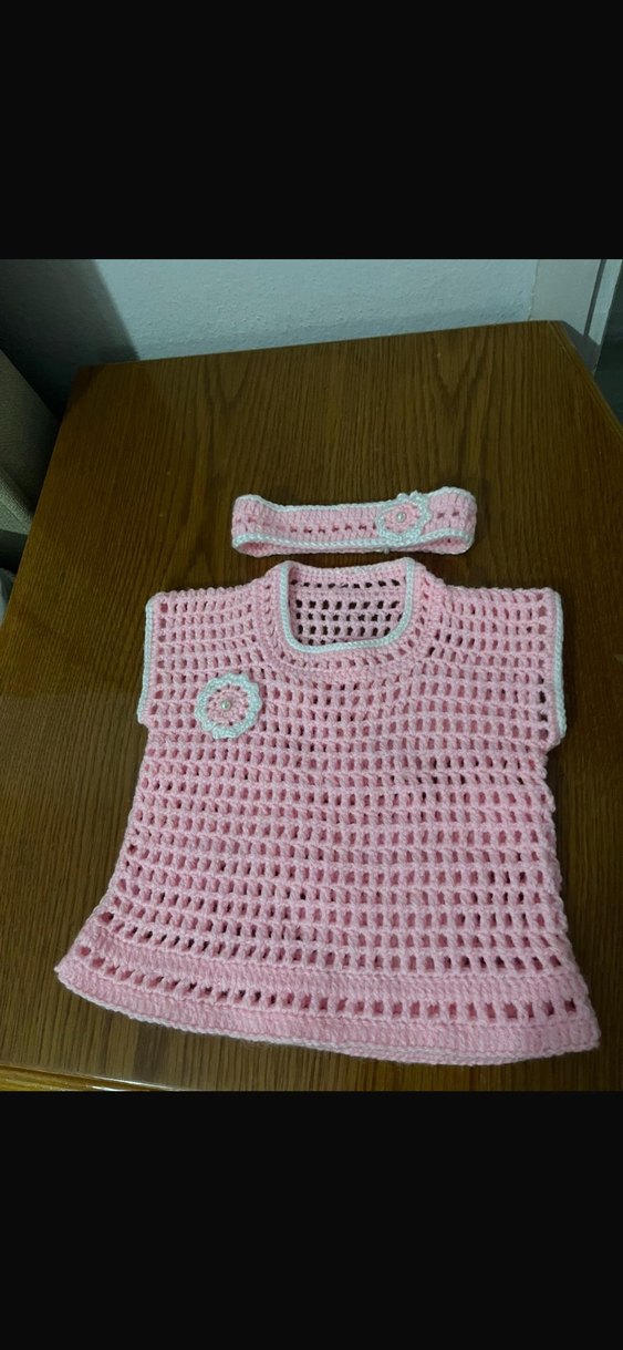Pembe renkli, kolsuz, bol kesim örgü kız çocuk hırkası, bohem tarzda, eşleşen saç bandıyla birlikte. El örgüsüdür sıfır ürün