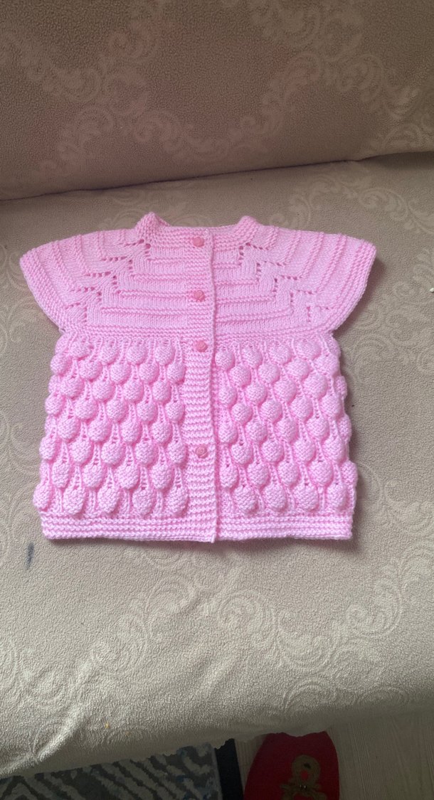 Pembe renkli, kolsuz, kız çocuk hırkası; düz ve desenli örgü detaylarıyla renkli ve fitted tasarıma sahiptir. Anti pilling bebe yünü ile örüldü istenilen renk ve boyutta yapılır 1 yala uygundur