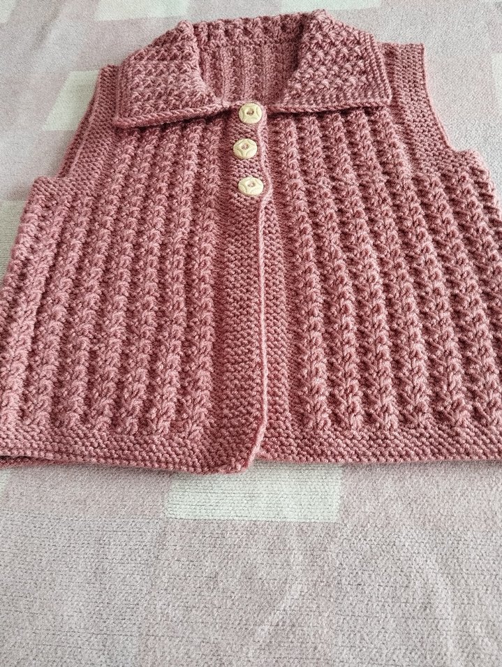 Pembe renkte, tek renk, örgü dokulu, düğmeli ve kayık yaka kadın süveter. Kolsuz ve normal uzunlukta, rahat kesimlidir.