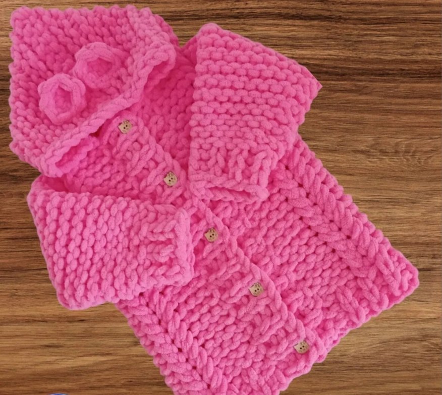 Renkli pembe örgü kız hırkası, uzun kollu ve bohem tarzda, rahat kesimlidir. Yumuşak örme kumaştan yapılmıştır ve ahşap düğmelidir.