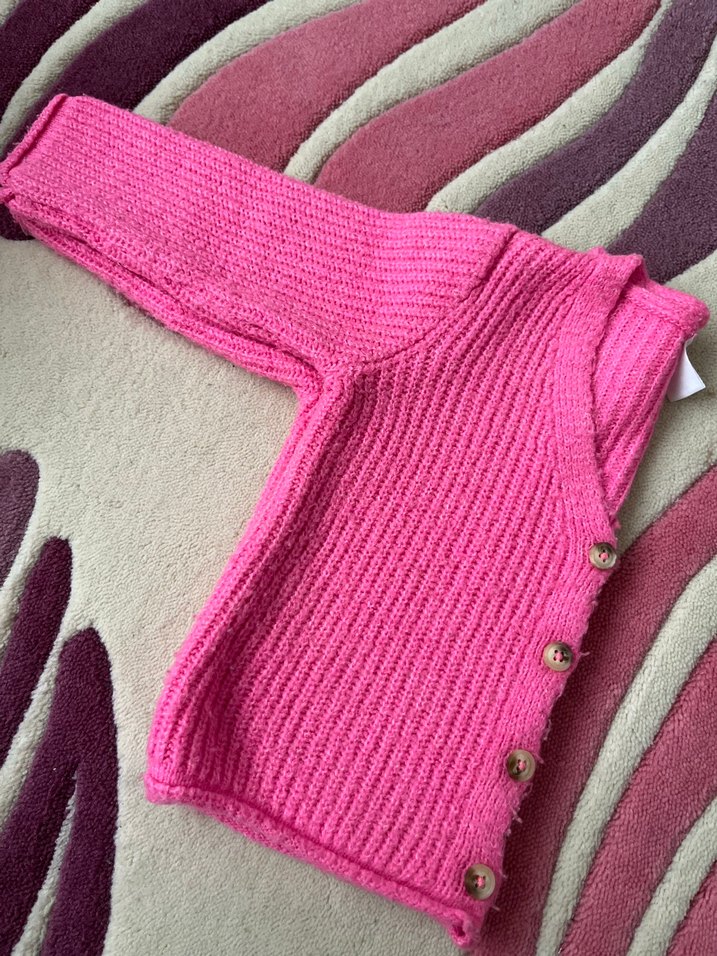 Pembe örgü, uzun kollu ve düğmeli kız hırkası, sade ve dar kesimdir. Yumuşak örgü kumaştan üretilmiştir.