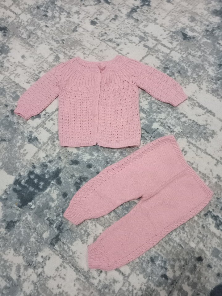 Pembe örgü kız hırka ve pantolon takımı, uzun kollu. Hiç kullanılmadı. El örmesidir. Hiçbir sökük vs. sorunu yoktur.