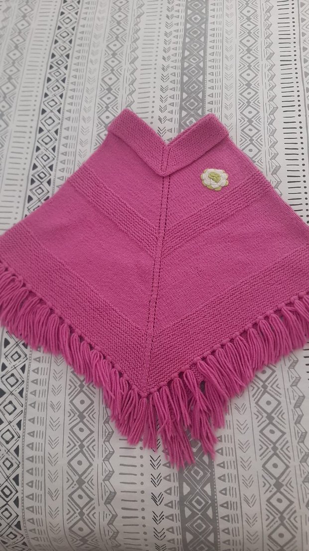 Renkli pembe örgü kız panço. bol kesimlidir, püskül detaylı. çiçek desenli. 3 4 yas icin uygundur