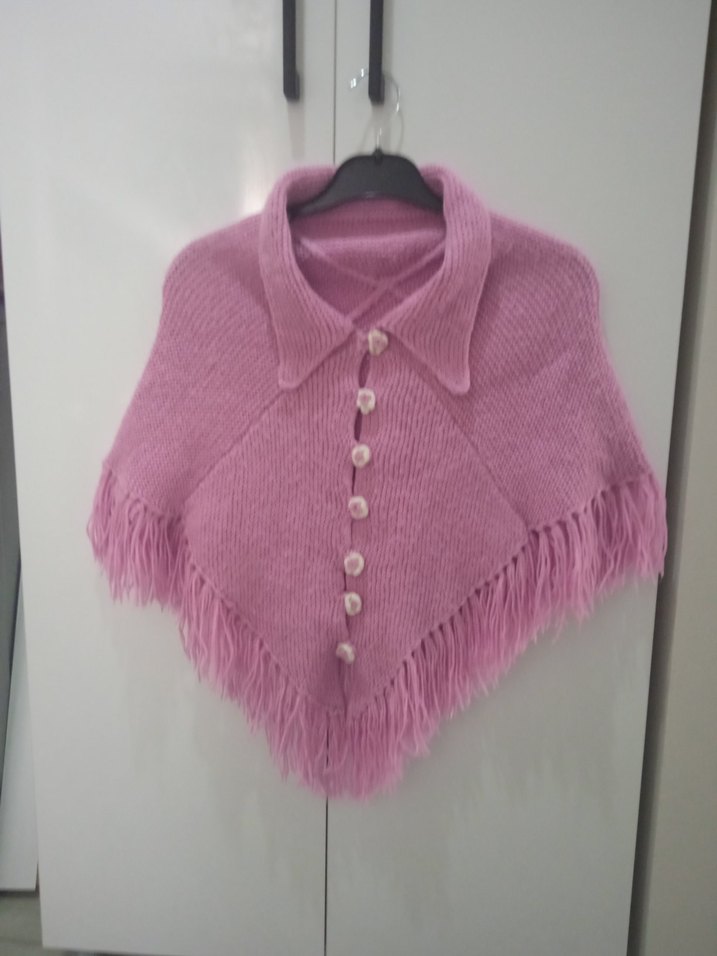 Pembe örgü kız panço, yakalı, kısa kollu ve bol kesimdir. Etek kısmında püskül detayları bulunan bohem tarzda, pastel renklidir, düğmesi de örgüden