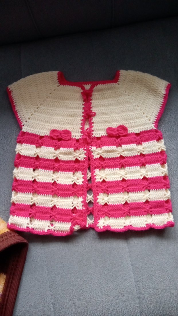 Kolsuz, pembe ve krem renkli örgü şeritler ve süslü fiyonklarla bohem tarzında, kızlar için dar kesim hırka.