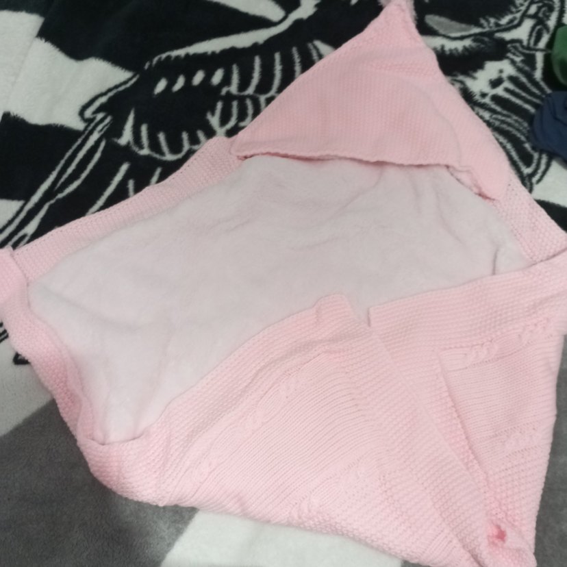 Pastel pembe renkte, yumuşak dokulu ve ince örgü desenli bebek kundağı Çocukları sıcak tutmak için uygundur.