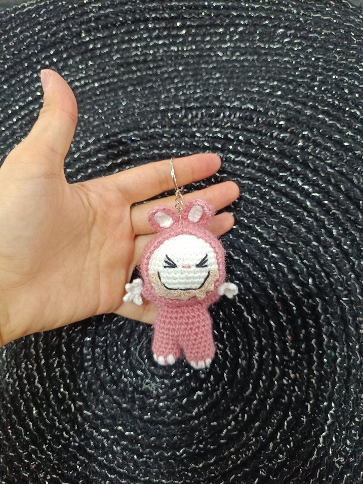 Pembe örgü malzemeden yapılmış, sevimli karakter tasarımlı labubu anahtarlık. Rahat ve karşı kültür tarzına uygun.