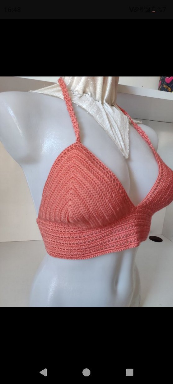 Hafif pembe, V yaka ve ince askılı, örgü mini büstiyer. Rahat ve bohem tarzda, günlük kullanıma uygun.