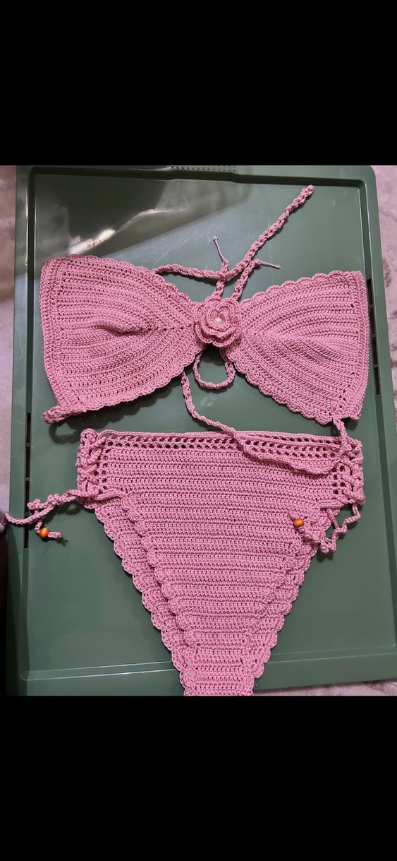 Pembe pastel renkli, örgü dokulu, askılı ve mini boy, bohem tarzı plaj için uygun kadın bikini. Ürün tamamen el örgüsüdür. Kendimiz örüp satıyoruz sıfırdır