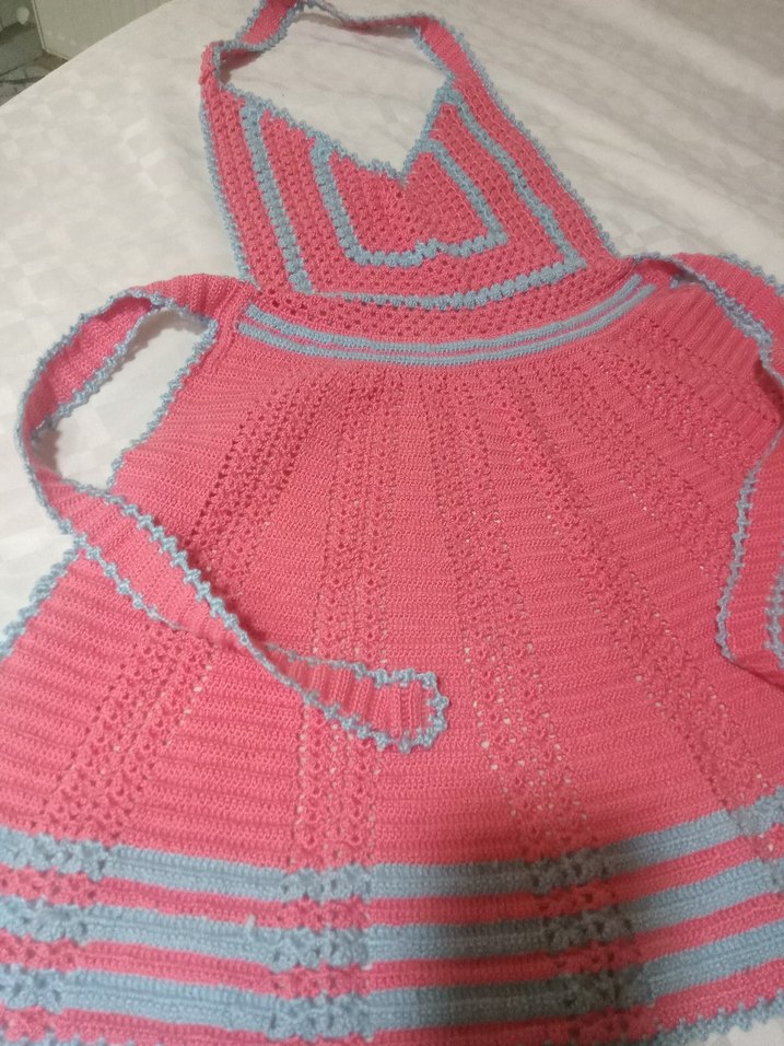 Pastel pembe renkli, el örgüsü tasarıma sahip, açık mavi şerit detaylı mutfak önlüğü. Uzun bağcıkları ve dokulu deseniyle rahat bir görünüm sunar.