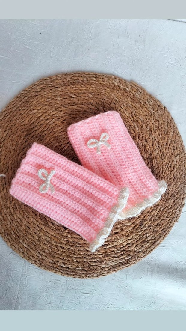 Pastel pembe örgü kadın eldivenler, beyaz fiyonk detayları ve dalgalı kenarlarla bohem tarzda, yumuşak ve vintage görünümlü.El emeği üründür.