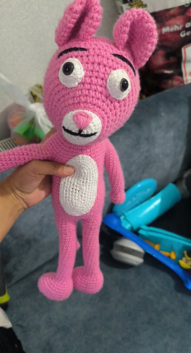 Büyük ifadeli gözlere ve beyaz bir karına sahip renkli pembe örgü peluş oyuncak. Yumuşak ve el yapımı tasarım.