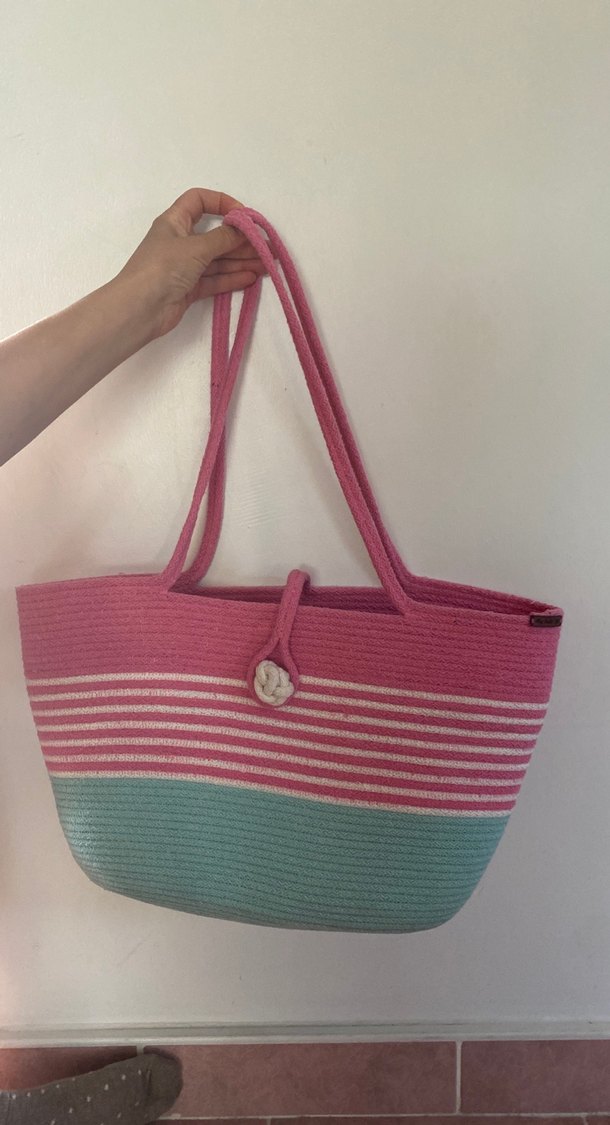 Pembe örgü plaj çantası, pastel tonlarda batik desenli ve uzun saplı, günlük kullanıma uygun bohem tarzda.