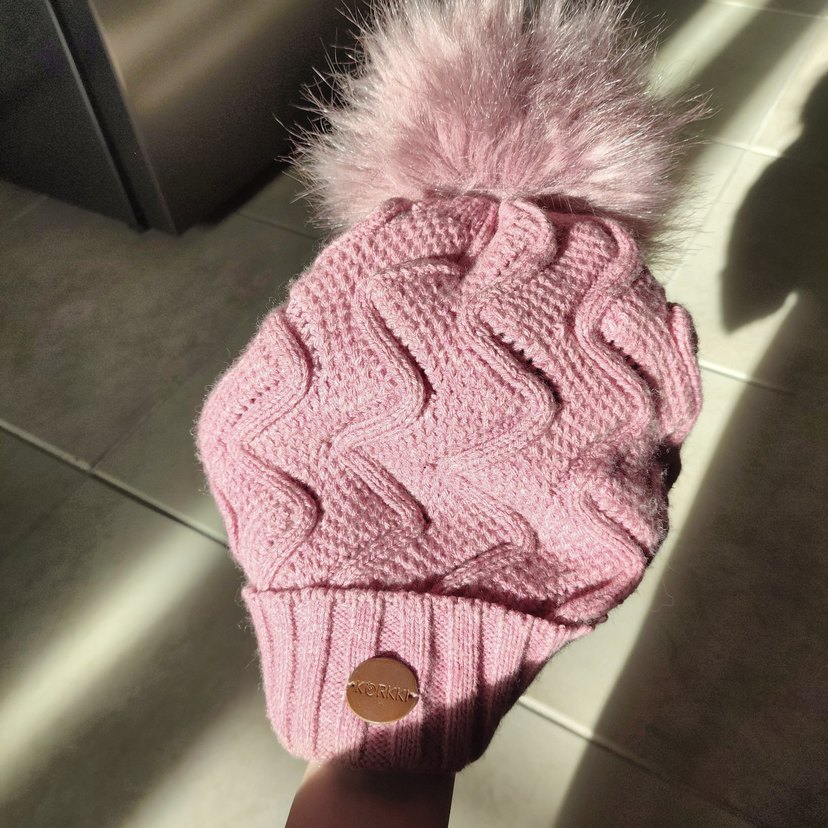 Pembe örgü bere, yumuşak ponpon ve dalgalı örgü deseniyle trend rahat ve bohem tarzı için uygundur.