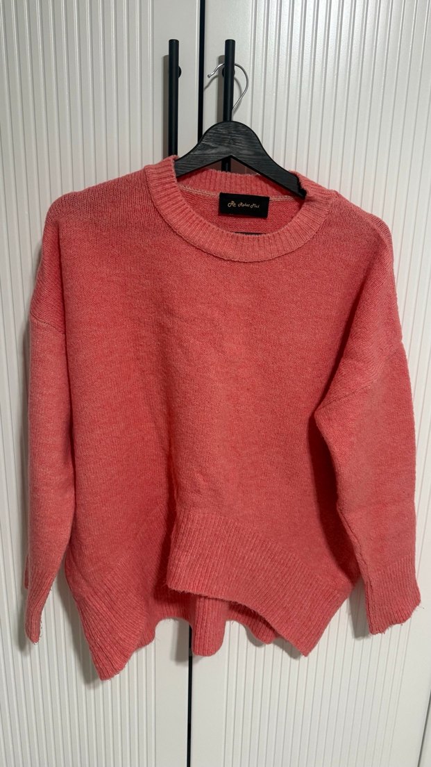 Pastel pembe örgü kazak, yuvarlak yaka ve uzun kolludur. Salaş kesimi ve normal boyu ile rahat ve günlük kullanıma uygundur.