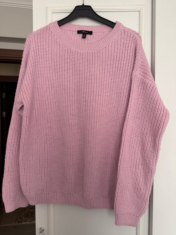Pembe örgü, uzun kollu, salaş kesim ve normal boyda kadın kazak. Pastel tonu ve rahat örgü dokusu günlük kullanıma uygundur.