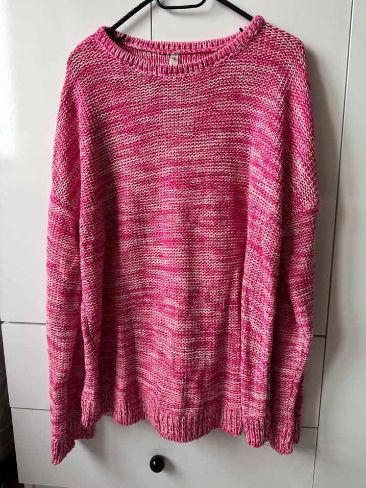 Pembe örgü kumaştan, uzun kollu ve yuvarlak yakalı salaş kesim kadın kazak. S M L bedene uygun