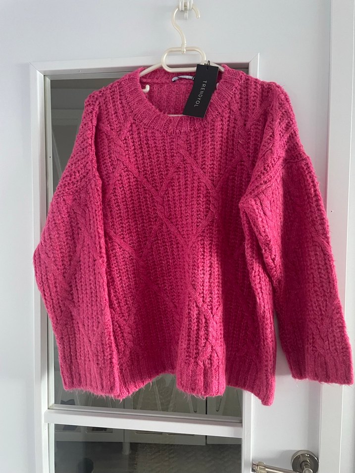 Koyu pembe renkli, uzun kollu ve yuvarlak yakalı örgü kazak. Salaş kesimi ve midi boyu ile rahat bir kullanım sağlar. Günlük sokak stiline uygundur. etikette sıfır üründür dokusu yumuşacıktır
