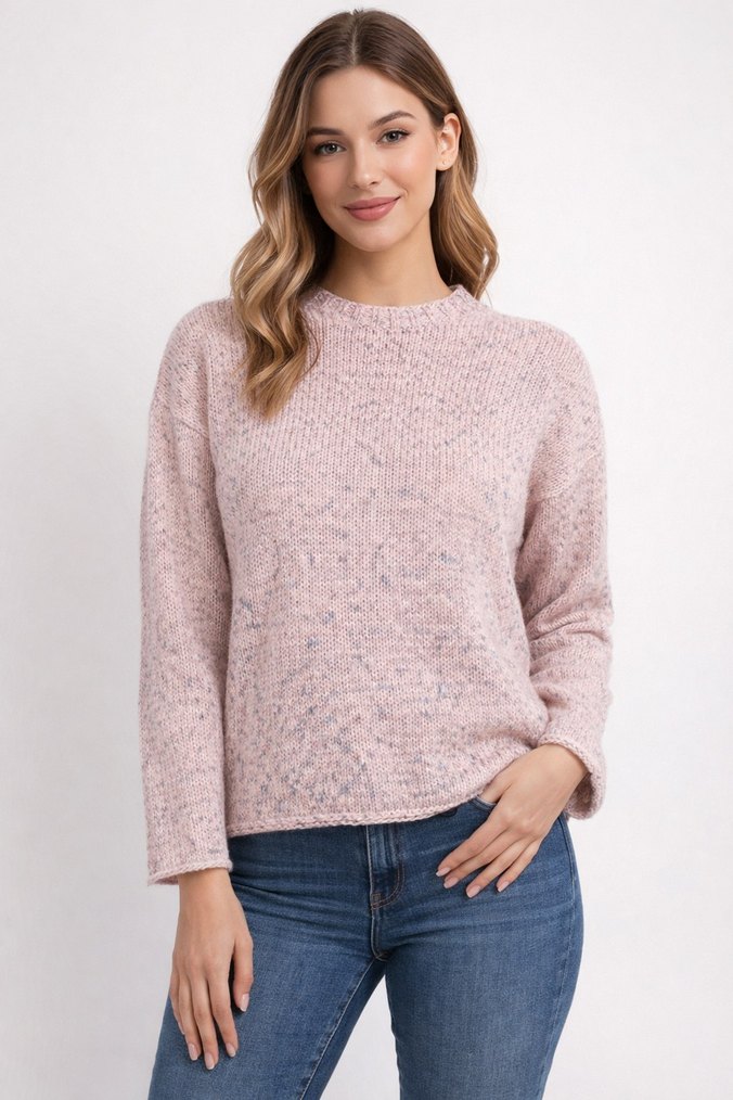 Pembe renkli, yuvarlak yaka ve uzun kollu örgü kazak. Salaş kesimi ve normal boyu ile günlük rahat kullanıma uygundur.
