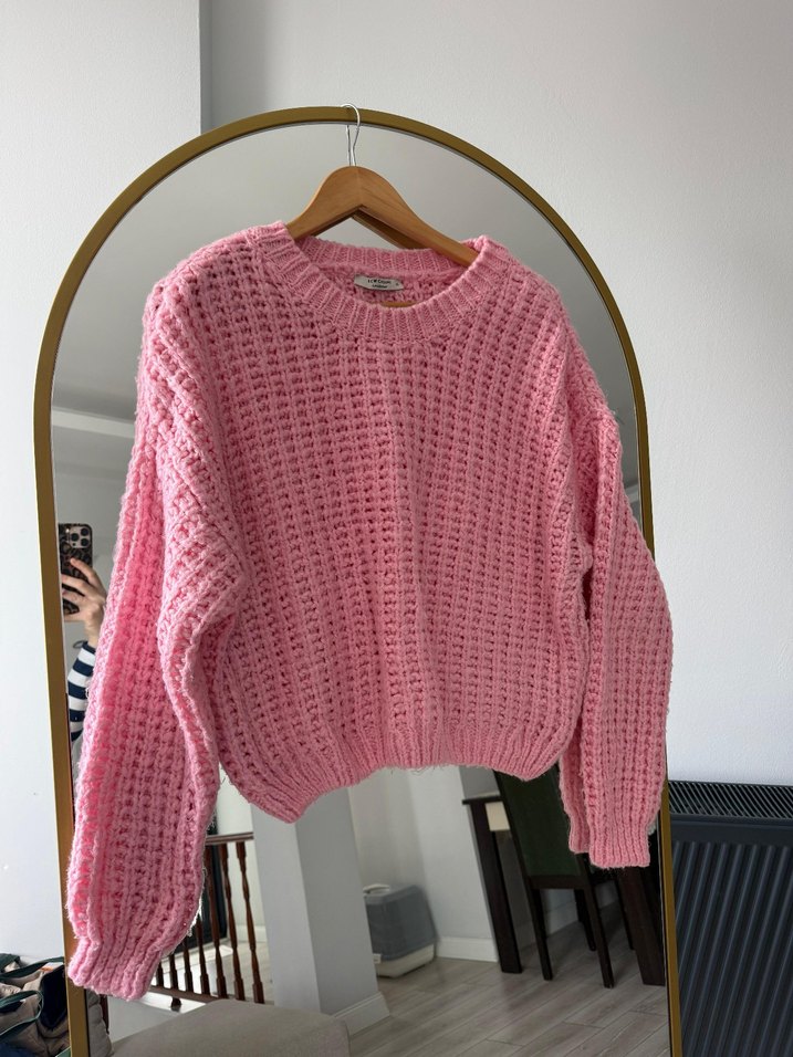 Pembe örgü kumaştan, salaş kesim, uzun kollu ve yuvarlak yakalı bu kazak, rahat ve günlük kullanıma uygun bir sokak stili sunar. Pastel tonları ve midi boyu ile dikkat çeker.