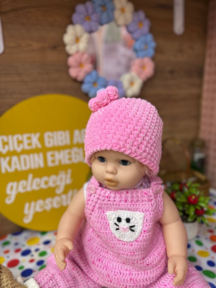Pembe örgü şapka ve önünde çiçek motifi bulunan renkli bebek. Yumuşak dokulu ve detaylı yüz ifadesine sahip.