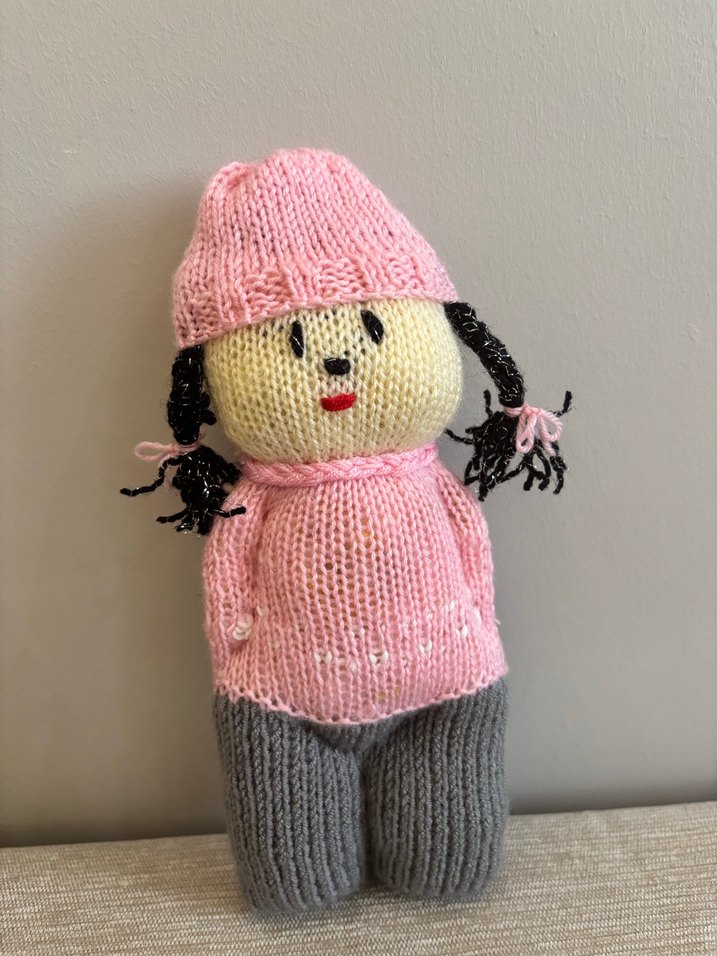 Pembe şapka ve kazak giymiş, gri pantolonlu, örgüden yapılmış oyuncak bebek. Örgülü siyah saçları ve basit yüz ifadesi bulunur.