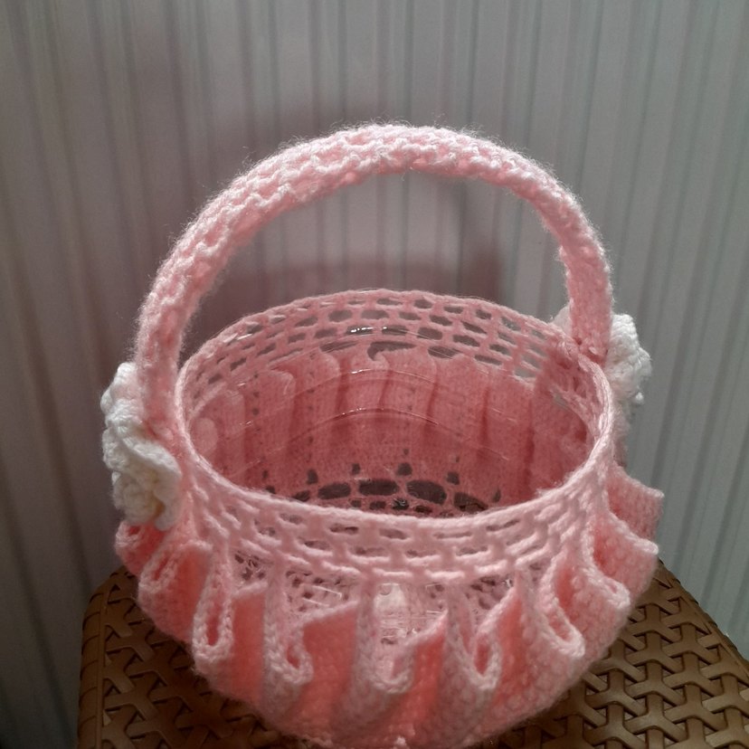 Pastel pembe örgü sepet, sağlam sap ve dekoratif kenarlarla depolama için uygundur.