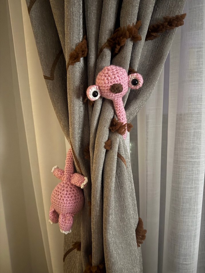 Pastel pembe renkte, örgüden yapılmış peluş perde bağlama tokasıdır. Sevimli hayvan figürüyle perdeleri nazikçe tutar.