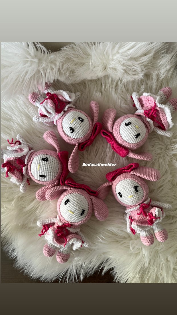 Yumuşak pembe örgü tavşan peluş oyuncaklar, pastel tonlarda ve sevimli yüz ifadeleriyle. Uzun kulaklı ve süslü kıyafetli.