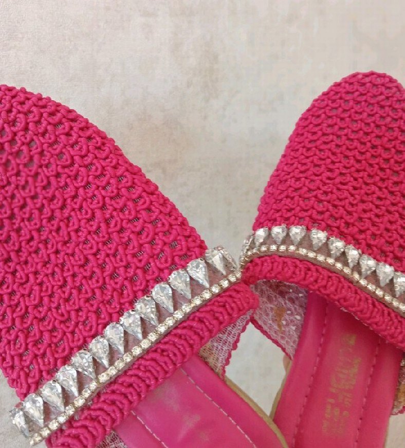 Pembe örgü malzemeden yapılmış, renkli nakış detaylı, topuklu kadın terliği. Düğün için uygun, gösterişli tasarım.