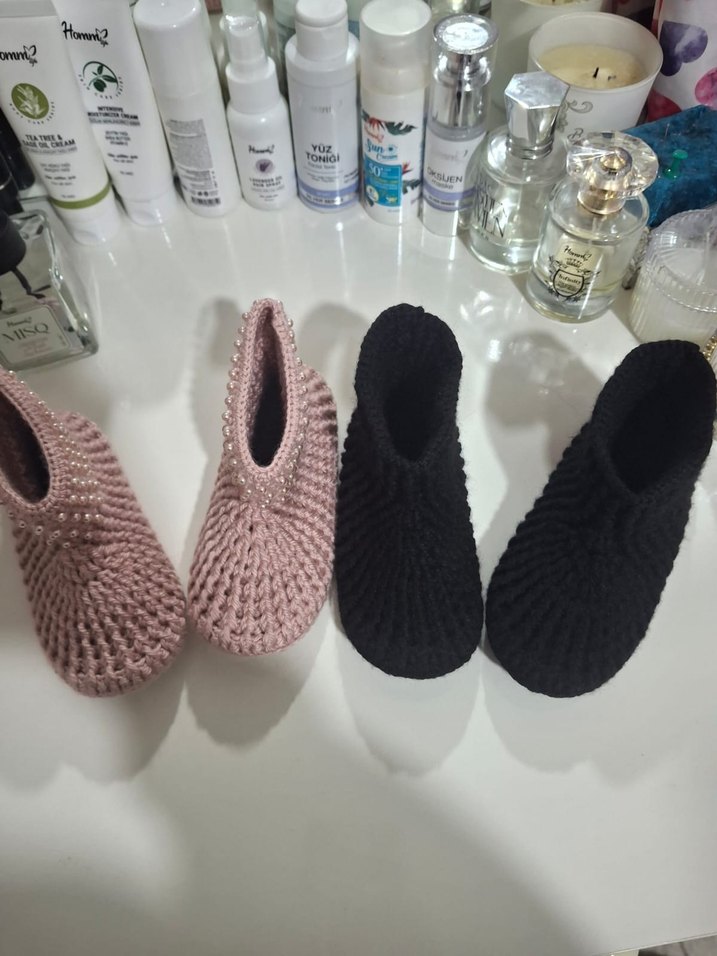 Kadın terlikleri, örgü dokusu ve ince topuklu tasarımıyla pastel pembe ve siyah renklerde. Günlük kullanıma uygun, rahat ve sıcak tutar.