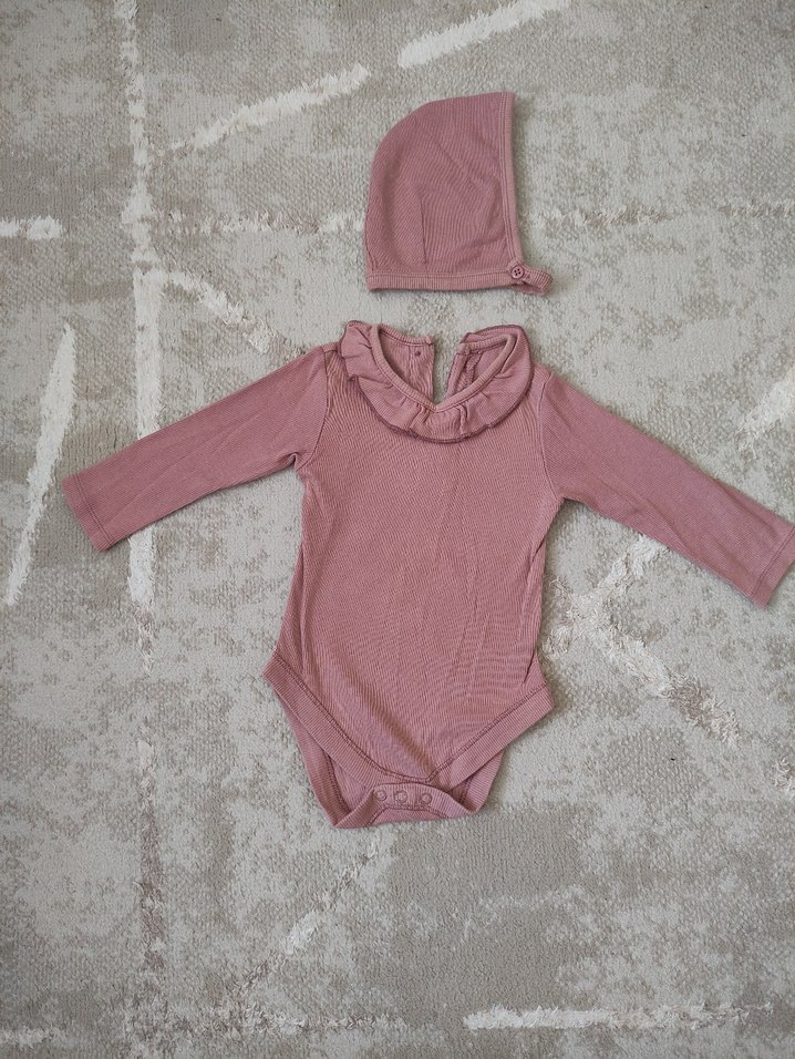 Pastel pembe renkli, örgü dokulu, uzun kollu ve boğazlı bebek body ile uyumlu şapka seti. Desensiz ve yumuşak dokulu.