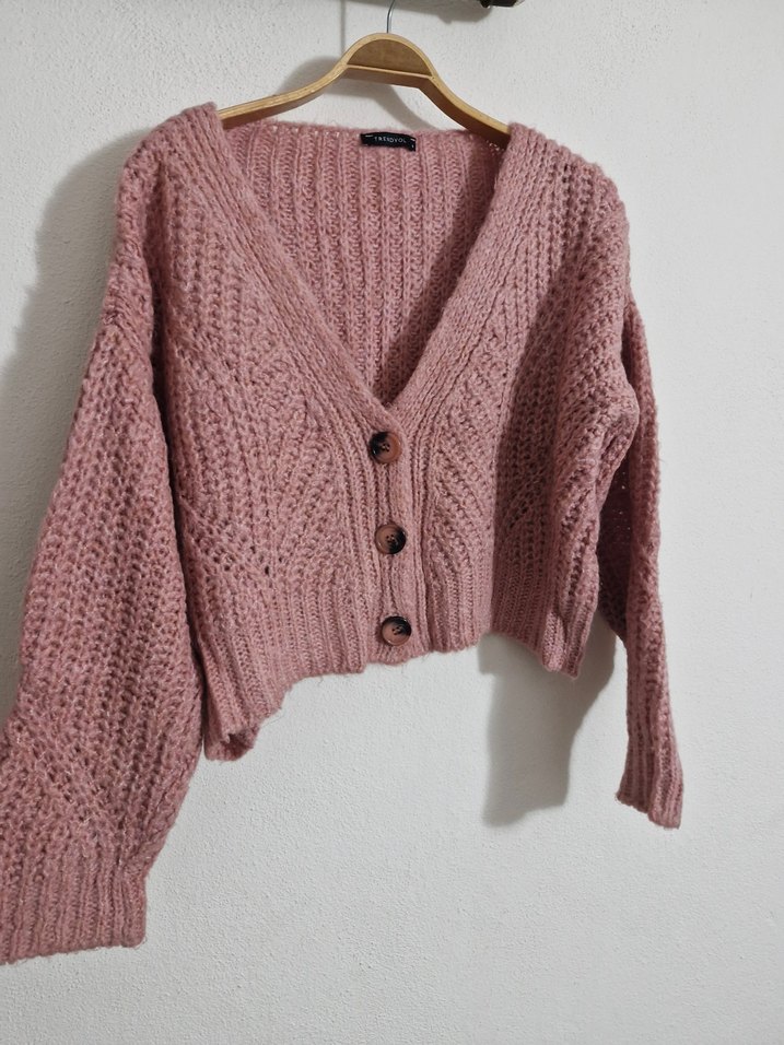 Pastel pembe renkte, örgü dokulu, bol kesim, uzun kollu ve V yakalı kısa boy hırka. Bohem tarzda rahat ve şık bir tercih.