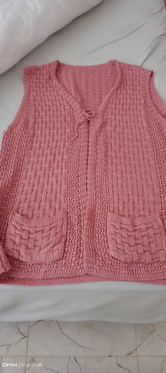 Pembe örgü kumaştan, V yaka ve kolsuz tasarıma sahip, bol kesim kadın yelek. Önde cepleri ve midi boyu ile rahat, bohem tarzda günlük kullanım için uygun.