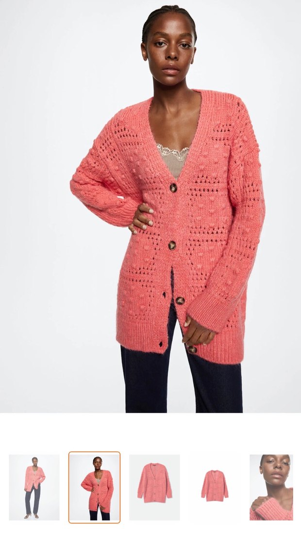 Pembe pastel renkte, örgü kumaştan, V yakalı, uzun kollu, salaş kesim midi uzunlukta rahat bir hırka.