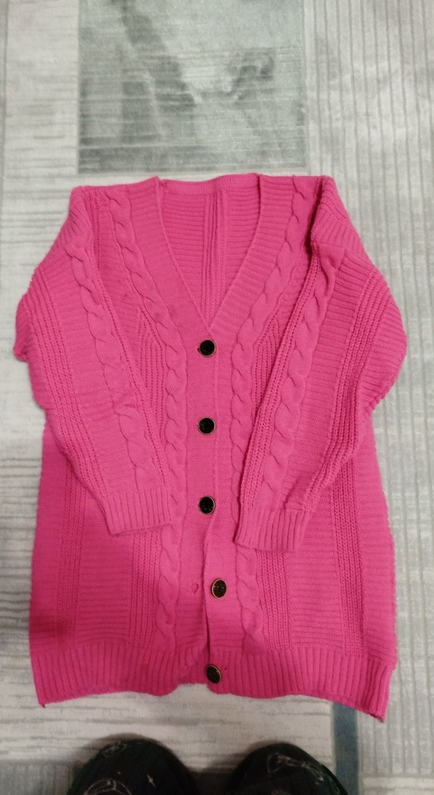 Pembe renkli, örgü dokulu, V yaka ve uzun kollu bu hırka normal uzunlukta ve bol kesimdedir. Rahat ve sade tasarımıyla günlük kullanıma uygundur.