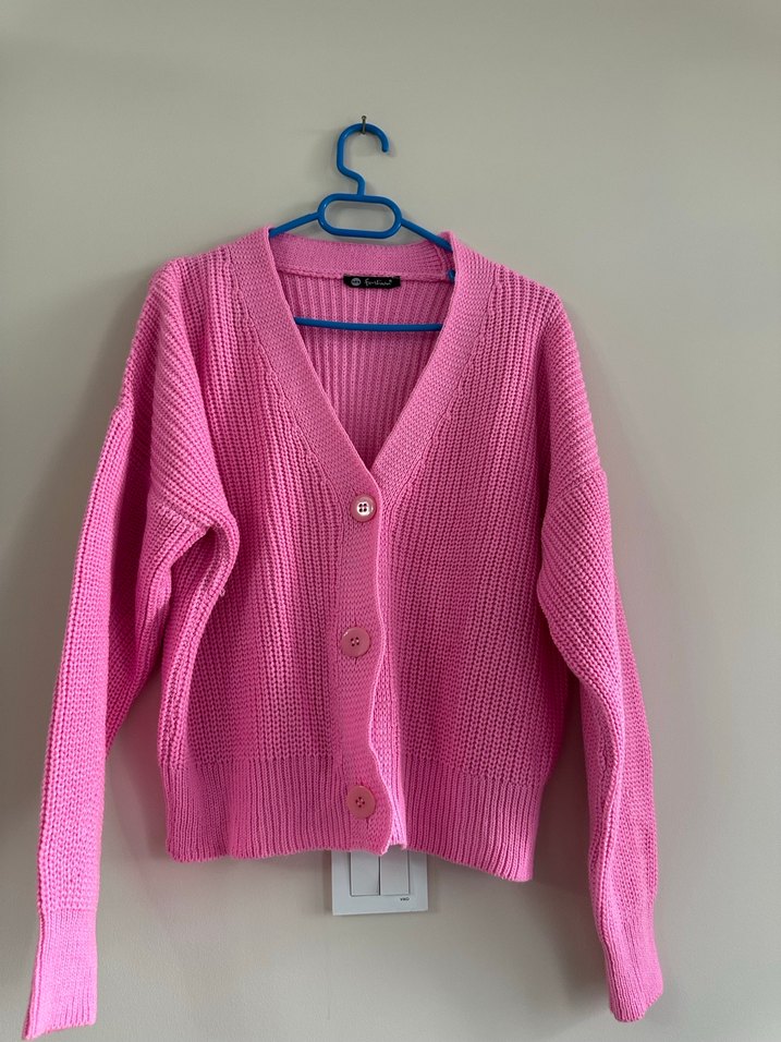 Pastel pembe renkte, V yakalı, uzun kollu ve bol kesim örgü kadın hırka. Normal midi boyda, düğmeli ve rahat kullanıma uygun.