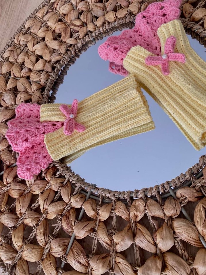 Pastel pembe örgü eldivenler, zarif fiyonk detayı ve rahat bohem tarzıyla retro hippie görünümüne uygundur.