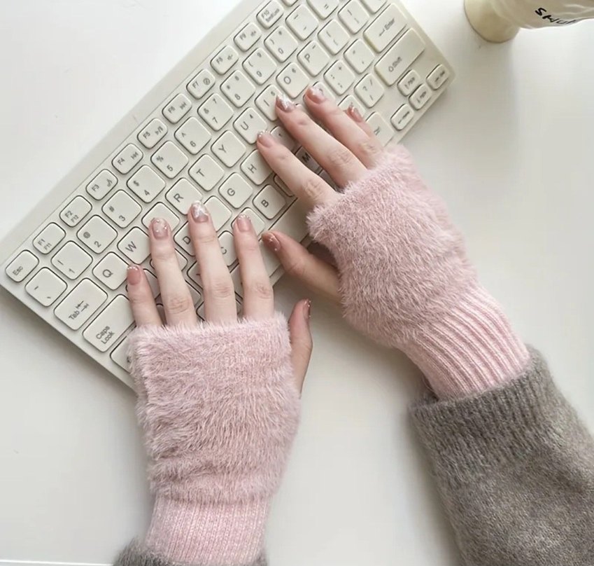 Pastel pembe renkli, yumuşak örgü kumaştan yapılmış yarım parmak kadın eldiveni, rahat ve şık bir görünüm sunar.