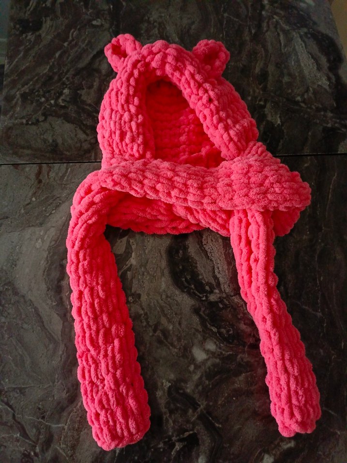 Renkli pembe örgüden yapılmış, küçük kulaklı kapüşonlu bere ve yumuşak dokulu atkı seti. Atkı uzunluğu 220 cmdir