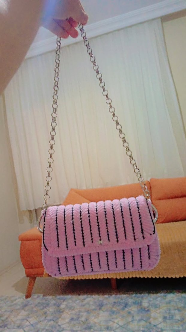 Pembe örgü kumaştan, çizgili desene sahip ve zincir askılı kadın çanta. Günlük kullanıma uygun bohem tarzda.