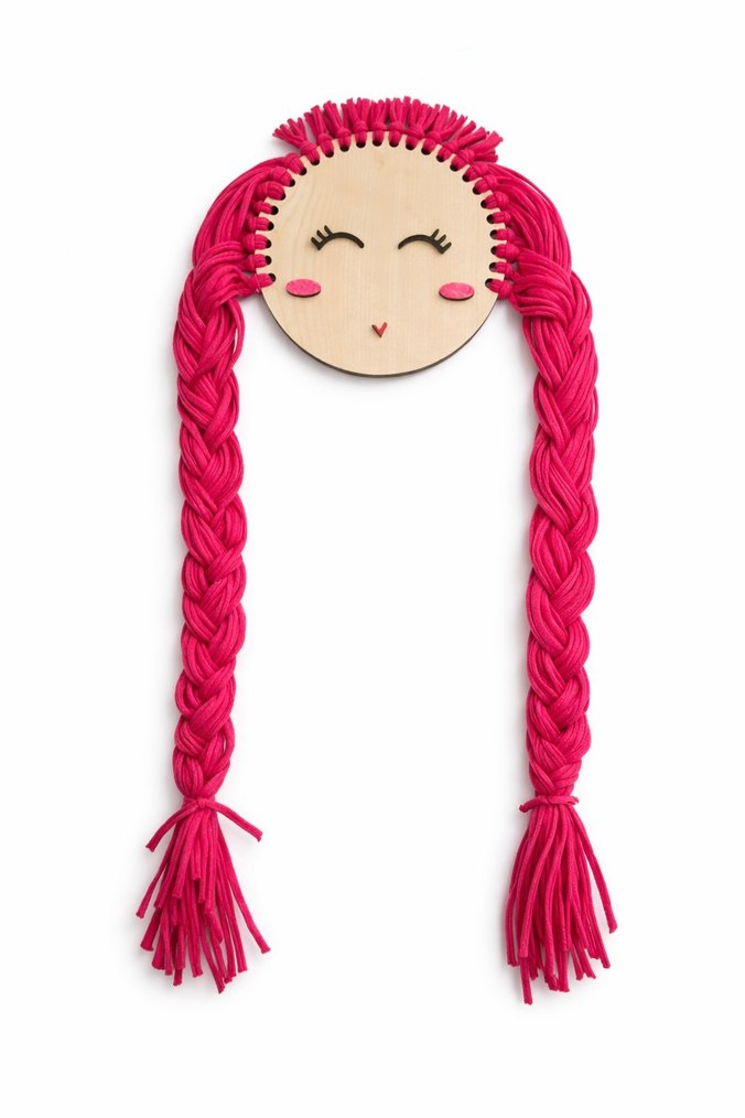 Ahşap yüzlü, uzun pembe örgülü saçlara sahip renkli bebek, basit ve gülen ifadeye sahiptir. tokalarınız artık düzenli ve bırarada olacak
