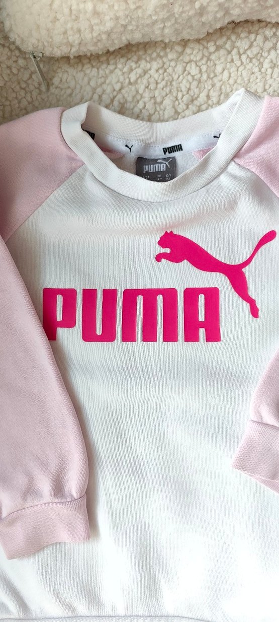 Sadec birkaç kez giyildi herhangi bir deformasyonu yoktur.Pamuklu yumuşak kumaştan yapılmış,içi şardonludur, baskılı PUMA logosu bisiklet yaka ve uzun kollu, pastel pembe ve beyaz renkli fitted kız çocuk takım