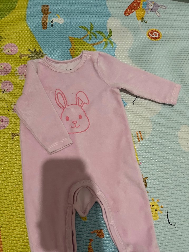 Pastel pembe renkli, yumuşak örme kumaştan yapılmış, önünde baskılı tavşan figürü bulunan uzun kollu bebek kız tulumu. Kolay giydirme için çıtçıtlı.