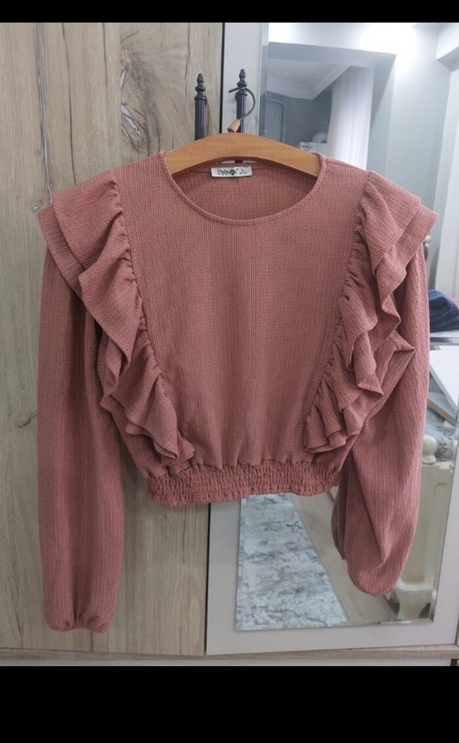 Pembe örme kumaştan, uzun kollu, yuvarlak yaka ve ön kısmında fırfır detayları olan kısa ve bol kesim bluz. Rahat sokak stili için uygundur.