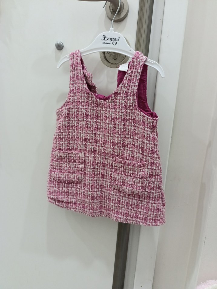 Kız çocuklar için pembe, kolsuz, örme dokulu ve bol kesim elbise. Yuvarlak yaka ve renkli batik desenlidir.