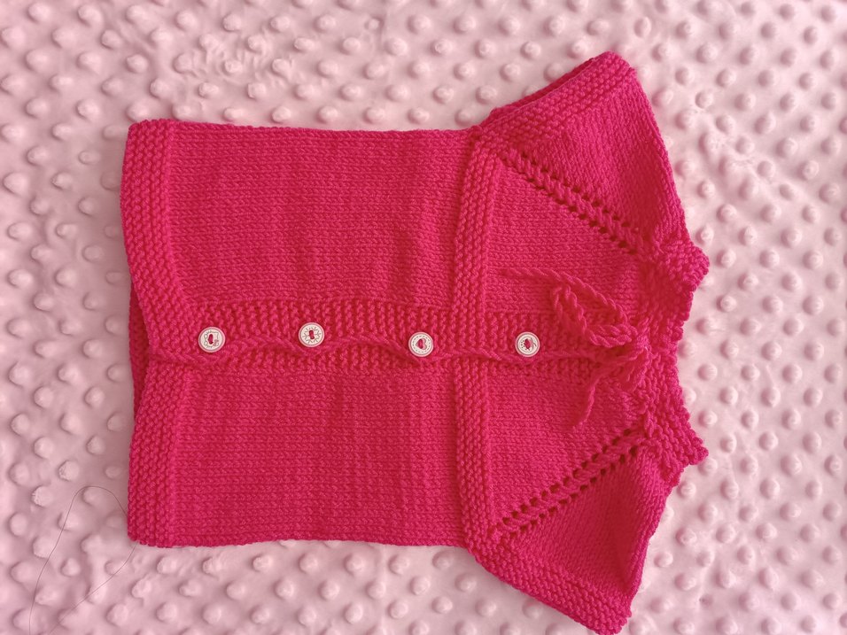 Kız çocukları için pembe örme, kolsuz, bohem tarzda, düğmeli ve yakasında bağlama detaylı, vücuda oturan süveter. 33 cm uzunluğunda