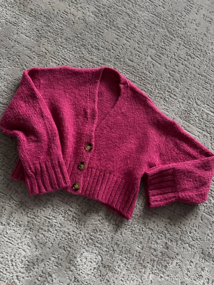 Uzun kollu, tek renkli, pembe örme salaş midi hırka. Tekne yaka ve düğmeli, günlük kullanıma uygun rahat bir model.