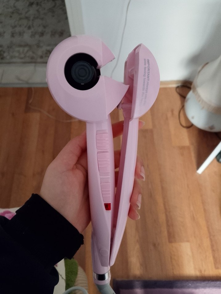 Pastel pembe renkte, kullanımı kolay otomatik saç maşası. Kompakt tasarımı ve rahat tutuşu ile saç şekillendirme sağlar.
